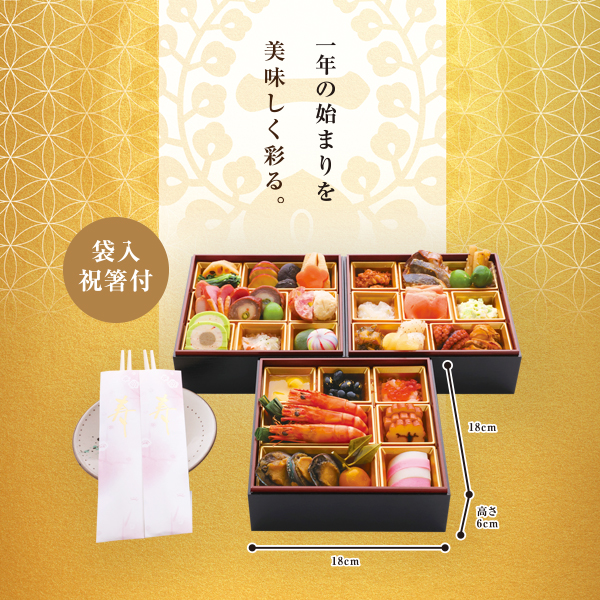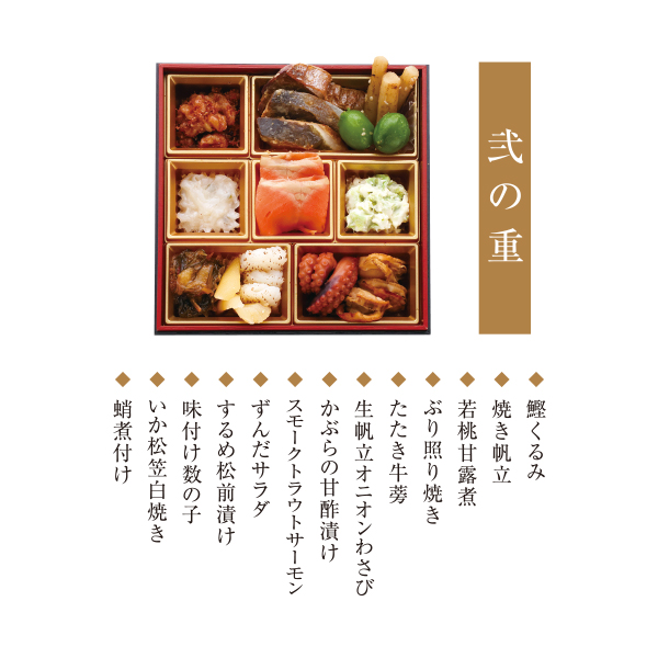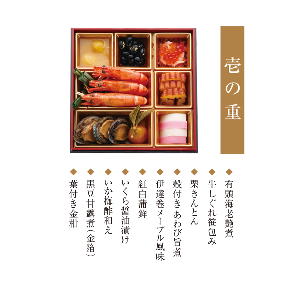 - 有頭海老艶煮、牛しぐれ笹包み、栗きんとん、殻付きあわび旨煮、伊達巻メープル風味、紅白蒲鉾、いくら醤油漬け、いか梅酢和え、黒豆甘露煮(金箔)、葉付き金柑