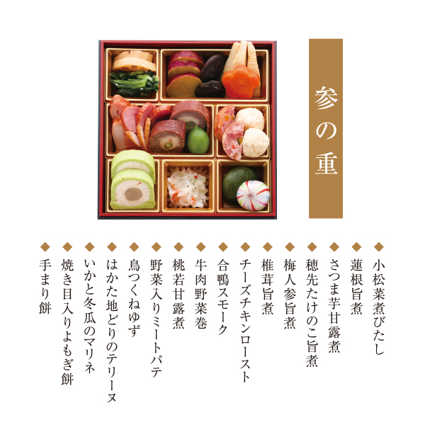 - 小松菜煮びたし、蓮根旨煮、さつま芋甘露煮、穂先たけのこ旨煮、梅人参旨煮、椎茸旨煮、チーズチキンロースト、合鴨スモーク、牛肉野菜巻、桃若甘露煮、野菜入りミートパテ、鳥つくねゆず、はかた地どりのテリーヌ、いかと冬瓜のマリネ、焼き目入りよもぎ餅、手まり餅